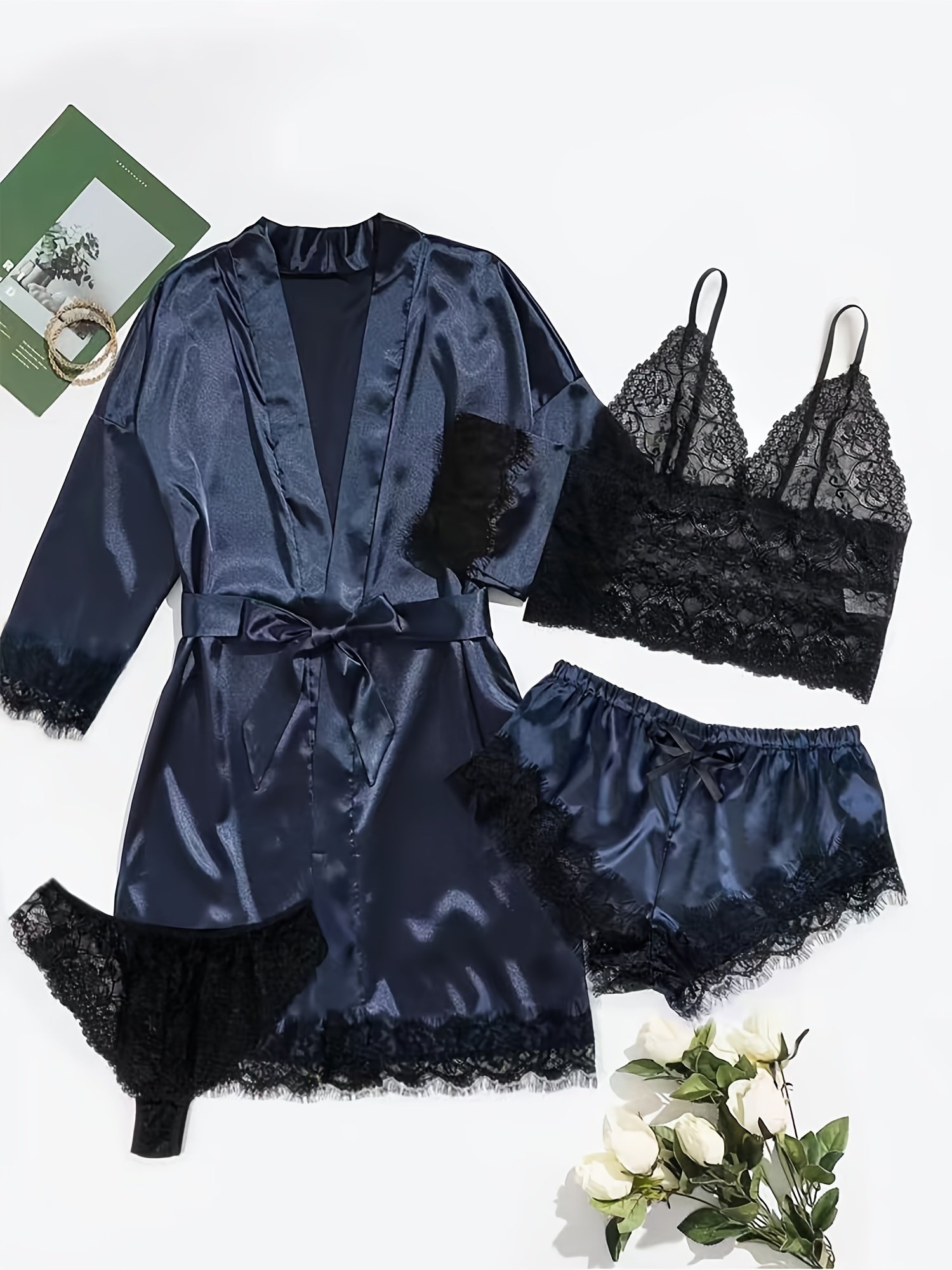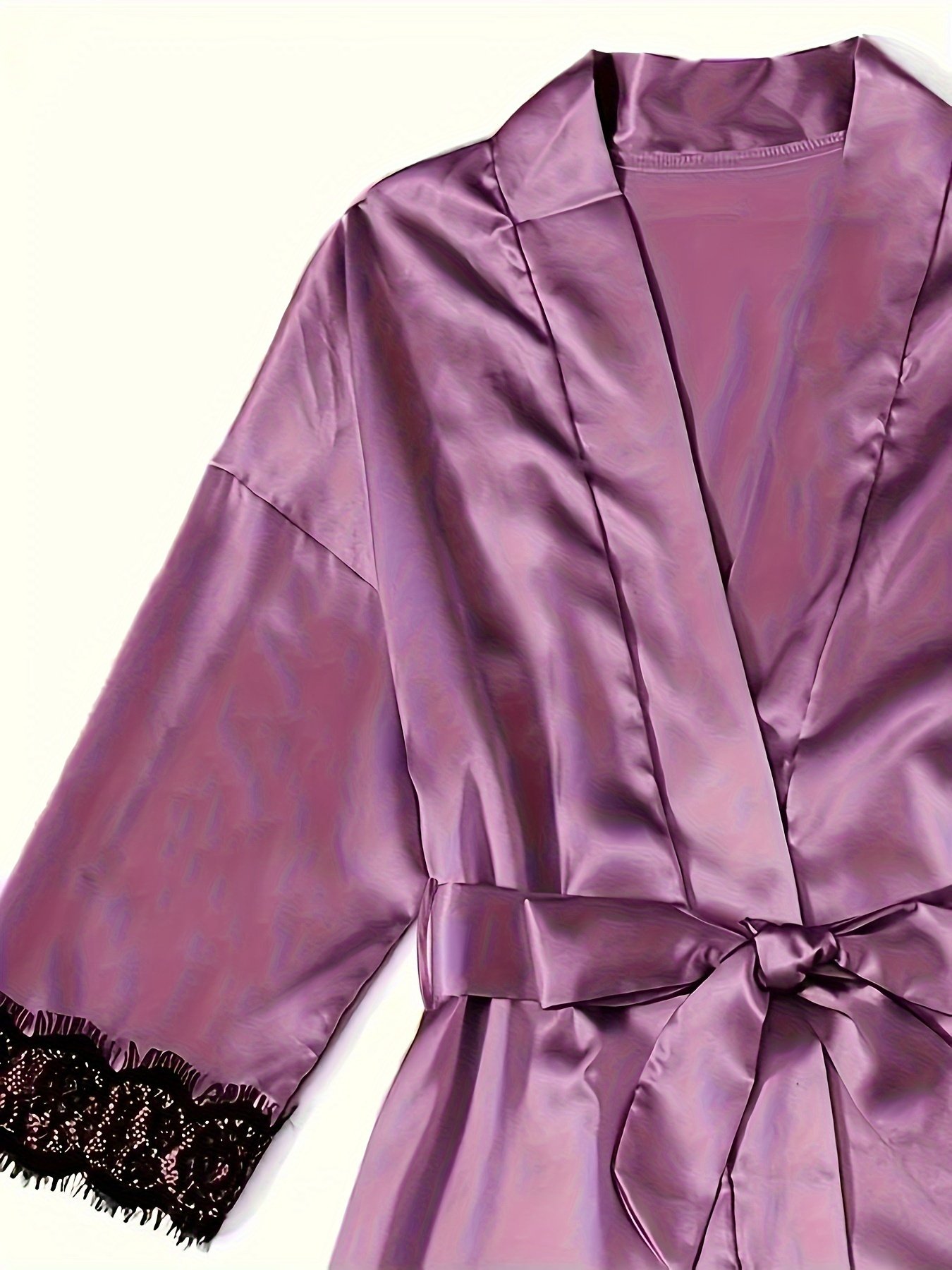 Composition: 97% Polyester 3% Spandex, Material: Polyester, Belt: Yes, Sleeve Length: Three Quarter Length Sleeve, Details: Contrast Lace, Pattern: Solid color, Applicable People: Adult, Sheer: Semi-Sheer, Collar Style: Crew Neck, Type: Long Sets, Season: All-season, Operation Instruction: Hand Wash, Style: Sexy, Other Material: Elastane, Printing Type: No Printing, Fabric Elasticity: Micro Elasticity, Weaving Method: Woven, Item ID: TM64700