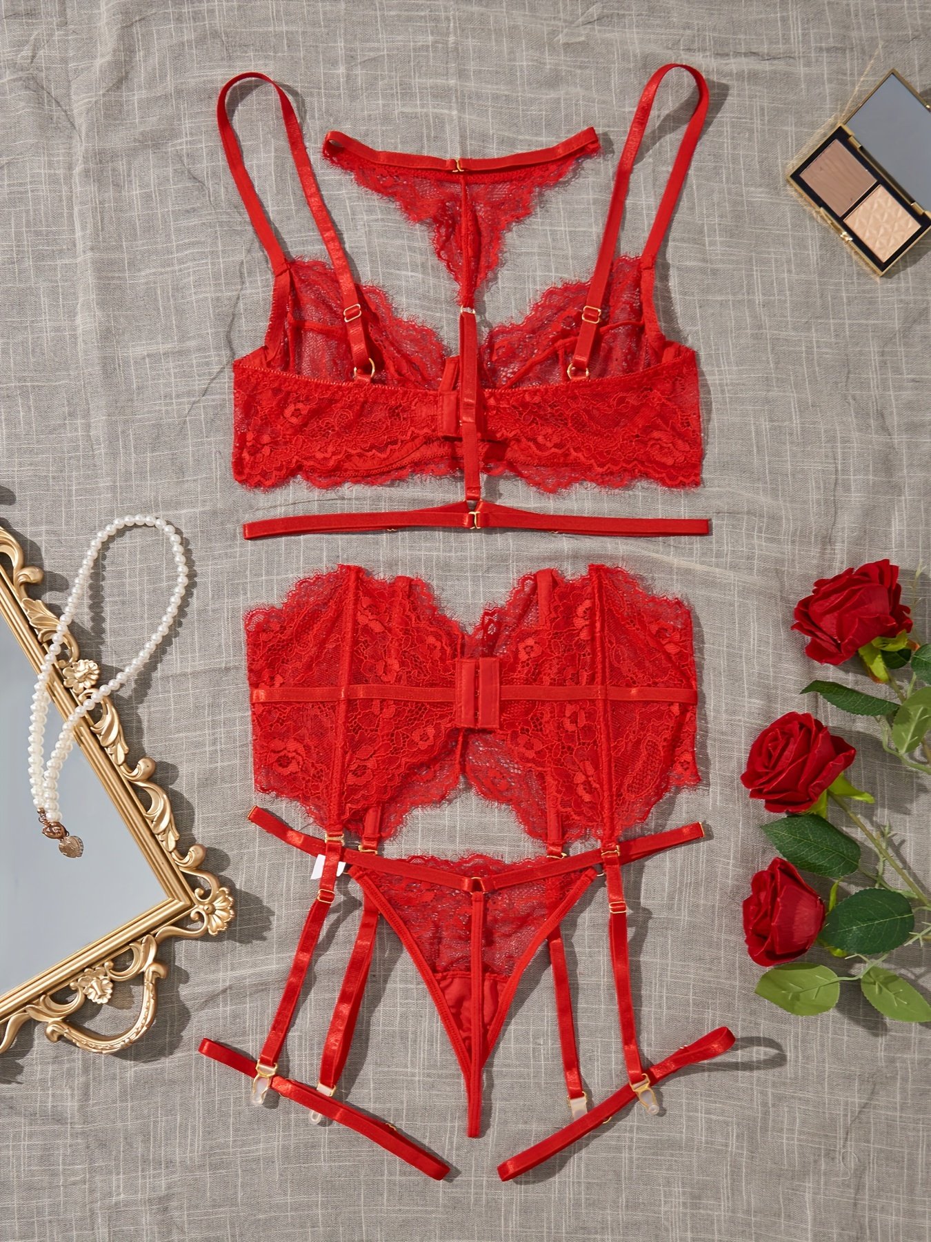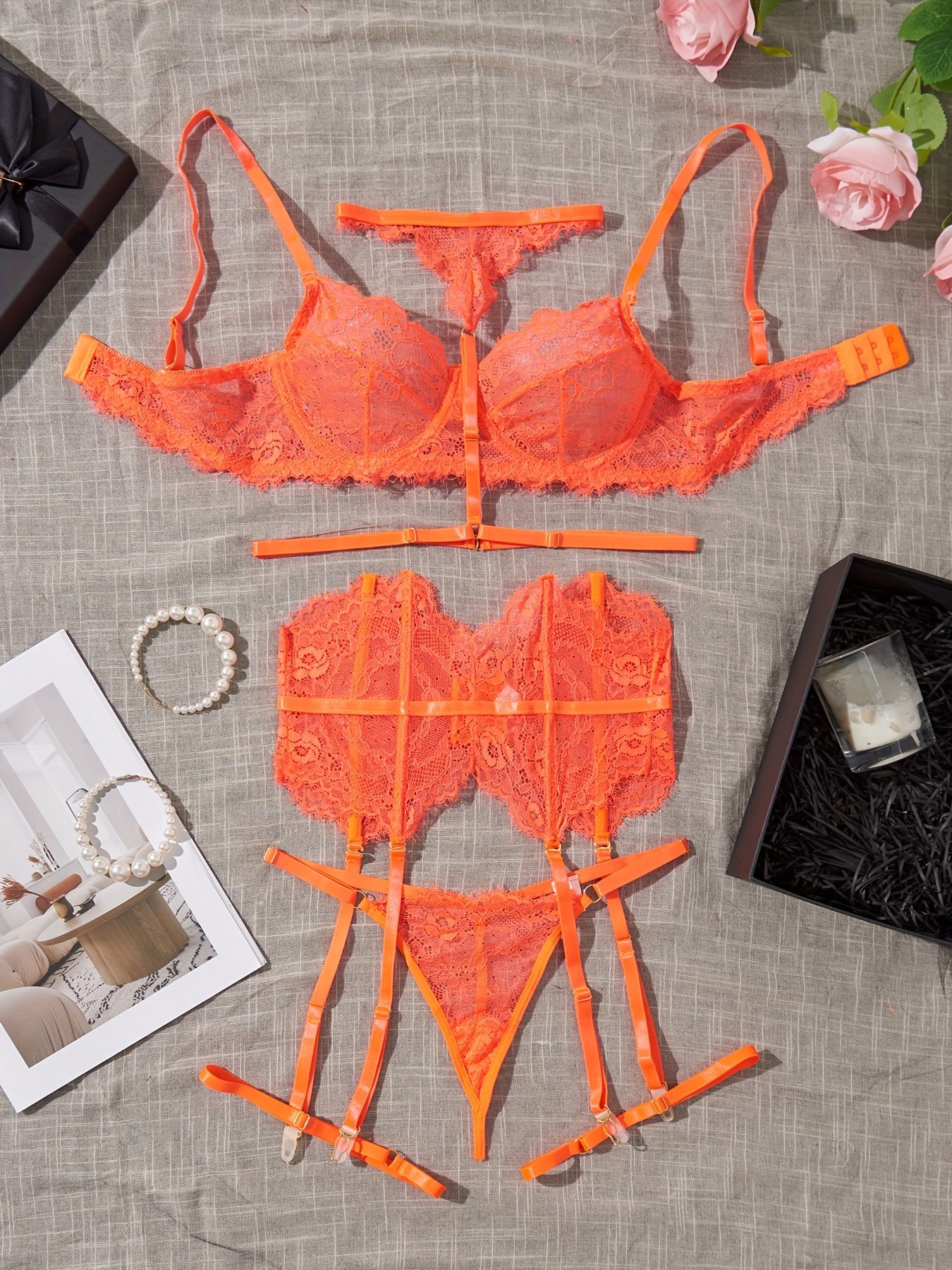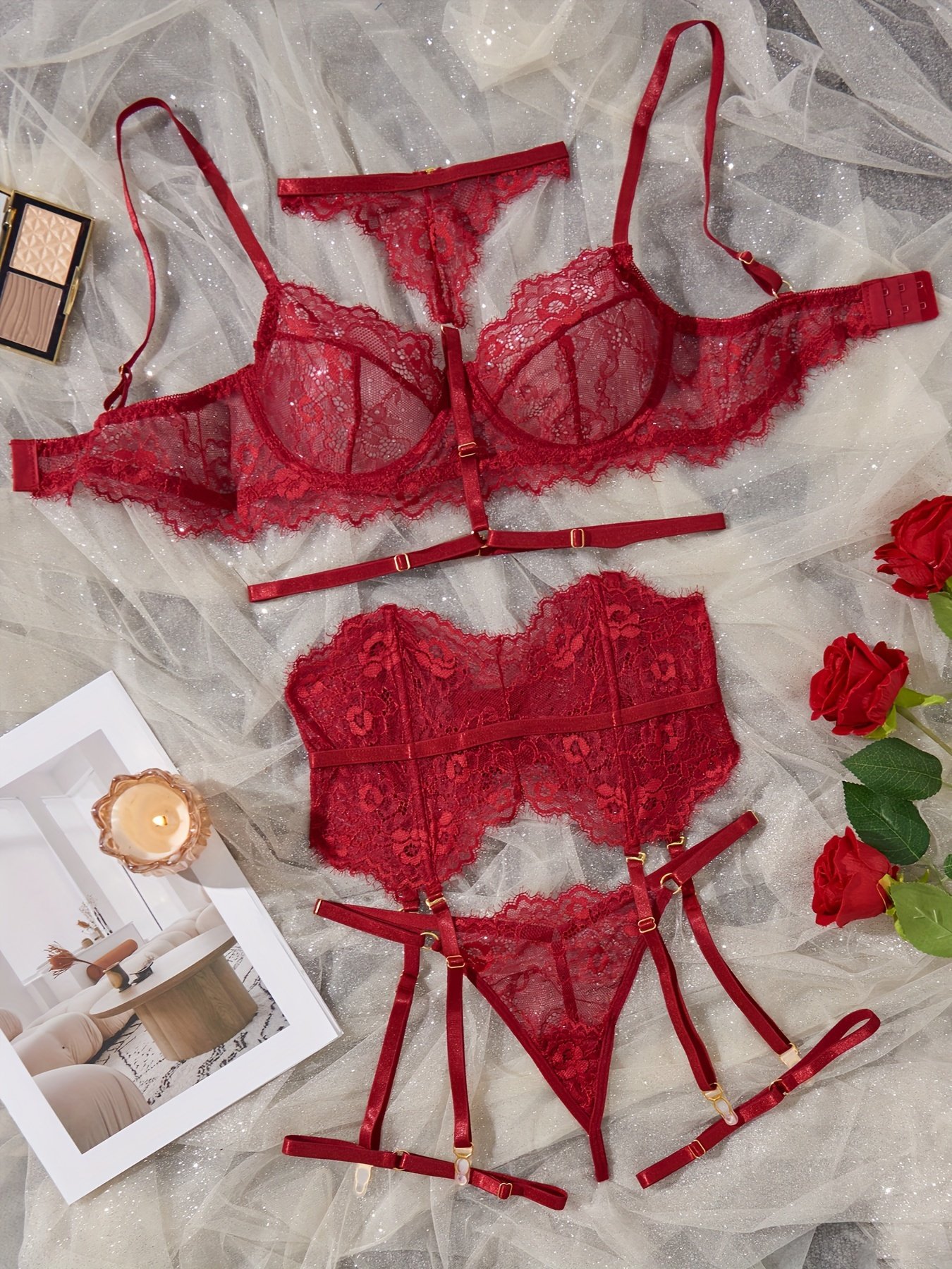 Composition: 95% Polyester 5% Elastane, Material: Lace, Gender: Female, Details: Contrast Lace, Pattern: Solid color, Applicable People: Adult, Sheer: Semi-Sheer, Type: Lash Sets, Operation Instruction: Hand wash or professional dry clean, Style: Sexy, Number Of Products: 6 Pcs, Weaving Method: Knit Fabric, Item ID: YK82624