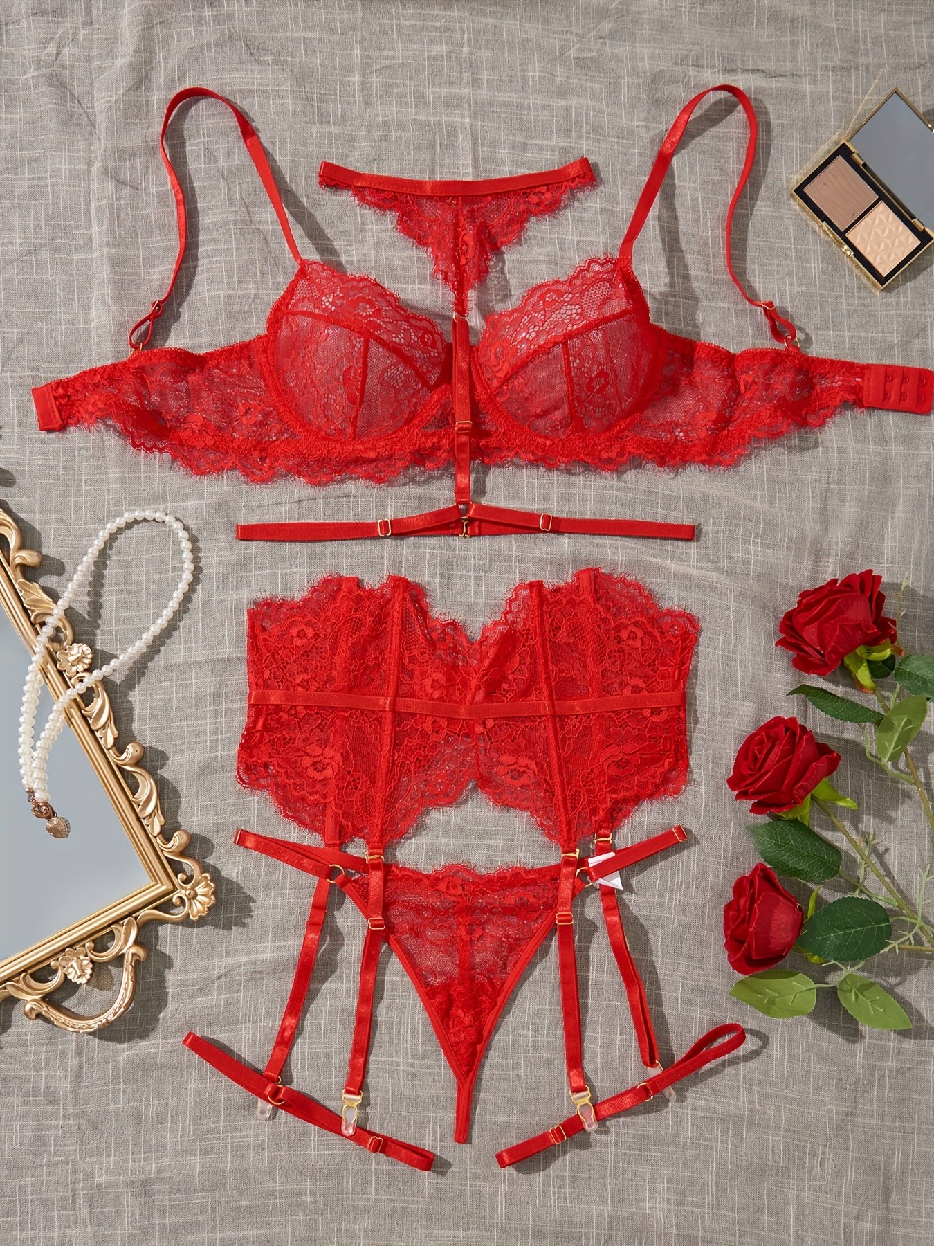 Composition: 95% Polyester 5% Elastane, Material: Lace, Gender: Female, Details: Contrast Lace, Pattern: Solid color, Applicable People: Adult, Sheer: Semi-Sheer, Type: Lash Sets, Operation Instruction: Hand wash or professional dry clean, Style: Sexy, Number Of Products: 6 Pcs, Weaving Method: Knit Fabric, Item ID: YK82624