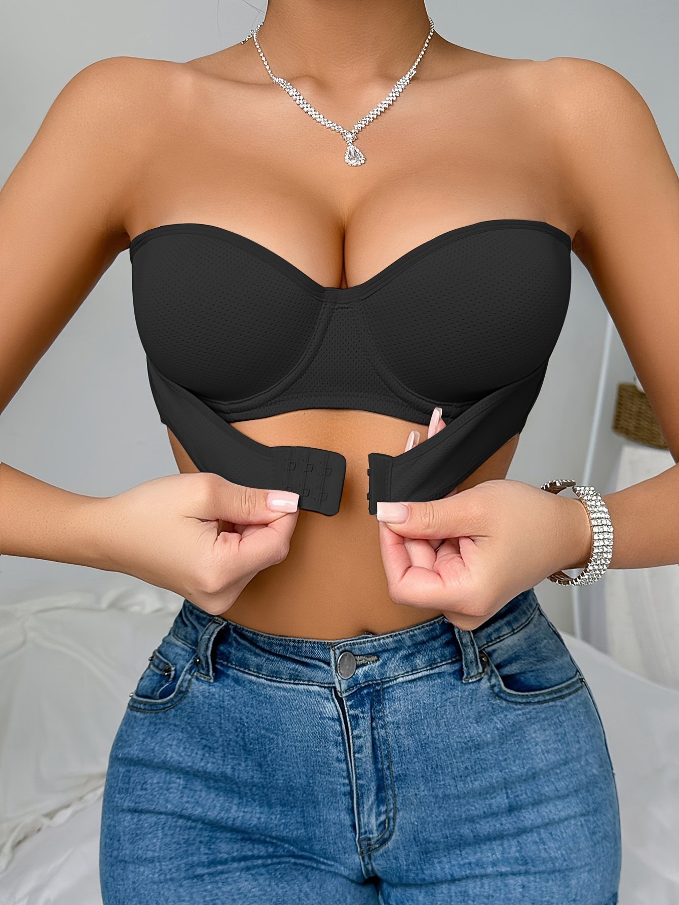 Composition: 90% Polyamide 10% Elastane, Material: Polyamide, Chest Pad: Non Removable Padding, Wires: Underwire, Details: Strapless, Pattern: Solid color, Applicable People: Adult, Sheer: No, Type: Bra, Operation Instruction: Hand wash,do not dry clean, Style: Glam, Weaving Method: Knit Fabric, Item ID: ML34101